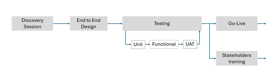 Inbound TMS Implementation consists of 4 phases: Discovery session, End-to-End solution design, Stakeholders training and Project Go-Live.